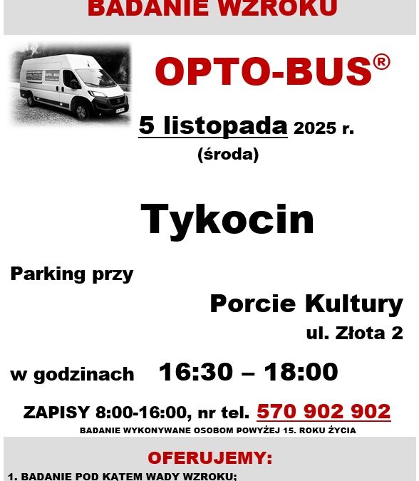 Bezpłatne badanie wzroku paź 9, 2025 | Aktualności, Zdrowie Szanowni Państwo, z przyjemnością informujemy, że 5 listopada zostanie przyprowadzone bezpłatne badania wzroku dla mieszkańców Tykocina. Zapraszamy do zapoznania się z informacjami umieszczonymi na plakacie.