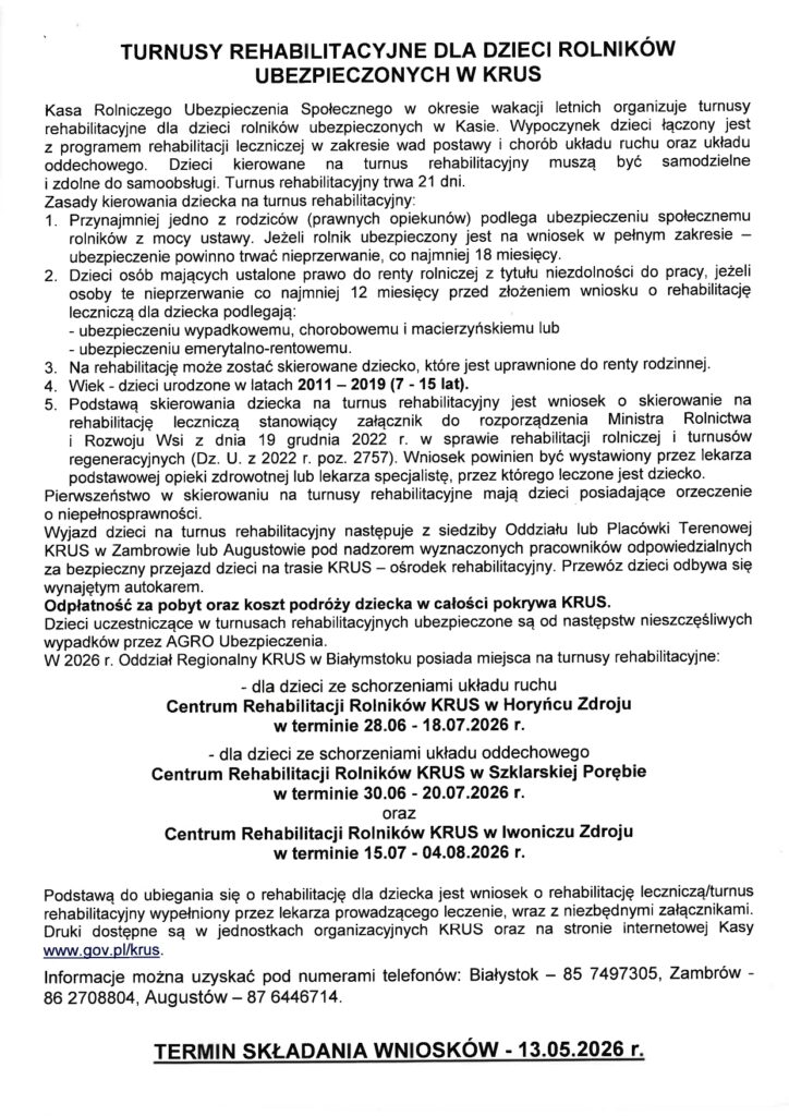 • Informacja dotycząca turnusów rehabilitacyjnych dla dzieci rolników ubezpieczonych w KRUS