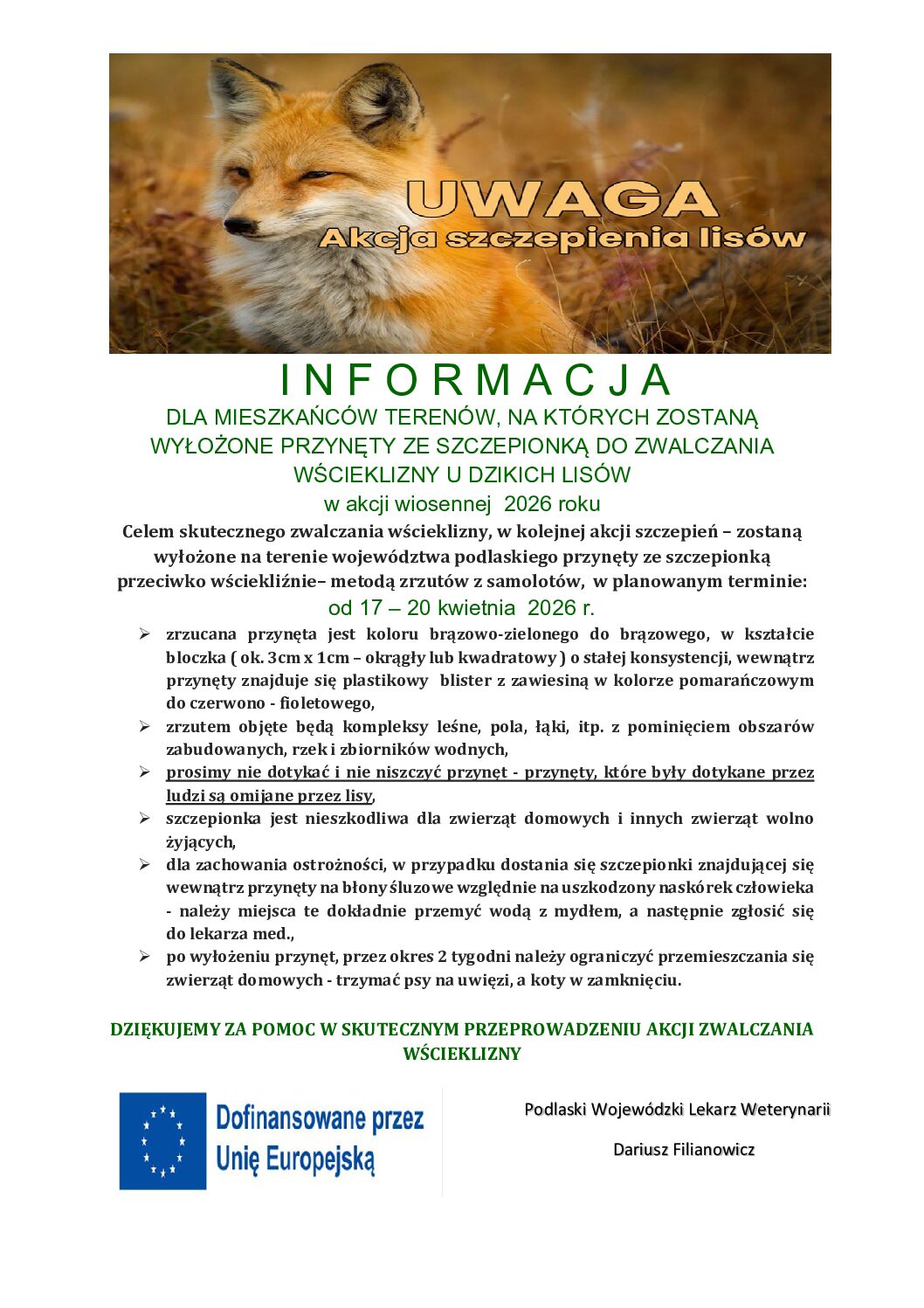 Wiosenna akcja szczepienia lisów przeciwko wściekliźnie. kwi 8, 2026 | Środowisko Powiatowy Lekarz Weterynarii w Białymstoku, za pośrednictwem Urzędu Miejskiego w Tykocinie, przekazuje informację o wiosennej akcji szczepienia lisów przeciwko wściekliźnie za pomocą zrzucanych z samolotów szczepionek.