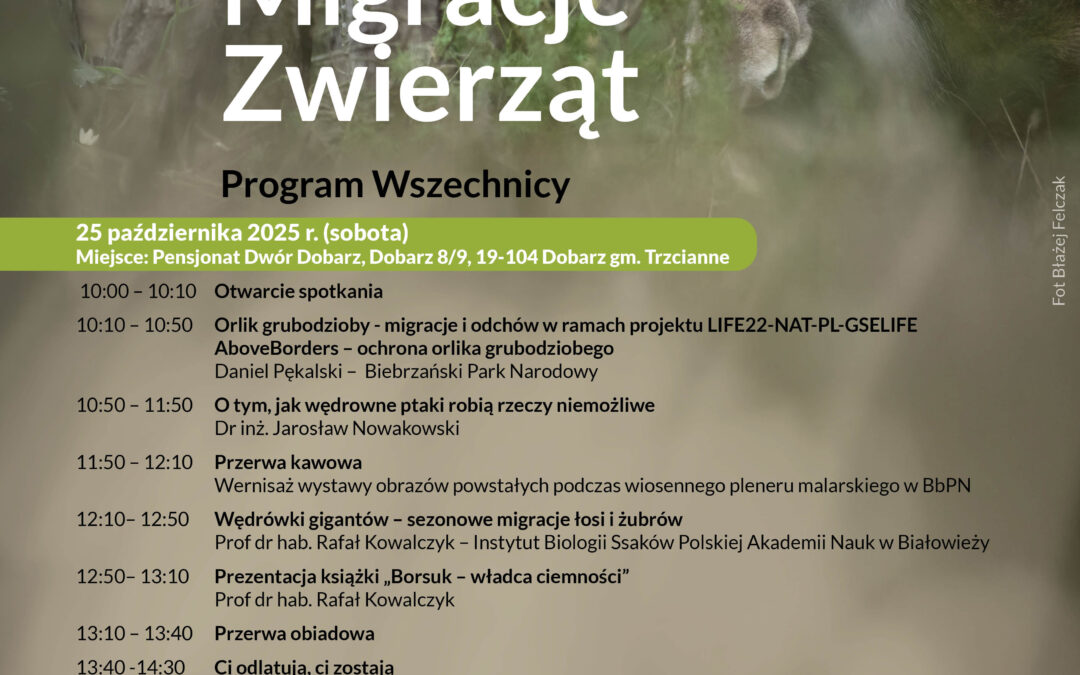 Szanowni Państwo, Biebrzański Park Narodowy zaprasza na 87. Wszechnicę Biebrzańską pt. „Migracje Zwierząt”. Wydarzenie odbędzie się 25 października 2025 r. (sobota) w Pensjonacie Dwór Dobarz, Dobarz 8/9, 19-104 Dobarz gm. Trzcianne