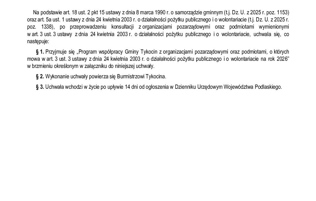 • Konsultacje społeczne w sprawie projektu Programu Współpracy Gminy Tykocin z organizacjami pozarządowymi oraz podmiotami, o których mowa w art. 3 ust. 3 ustawy z dnia 24 kwietnia 2003 r. o działalności pożytku publicznego i o wolontariacie na rok 2026.